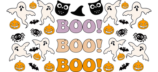 Diseño espeluznante y divertido con temática de Halloween que presenta figuras fantasmales, calabazas y la frase "¡Buu!" en colores vibrantes. Transferencias UV