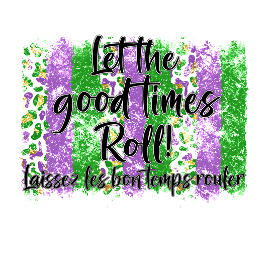 Celebrate with a vibrant design featuring "Let the good times roll!" in bold lettering, surrounded by festive purple, green, and gold stripes.DTF Transfers