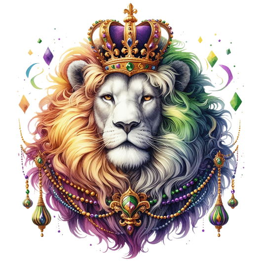 This vibrant artwork features a majestic lion adorned with a royal crown and intricate jewelry, showcasing colorful and flowing fur.DTF Transfers