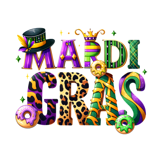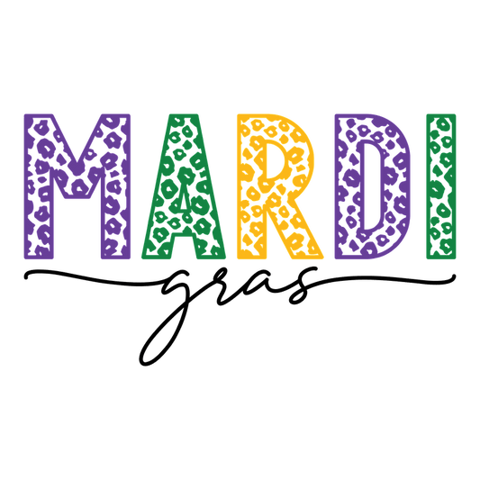 Celebrate Mardi Gras with vibrant, multicolored lettering featuring purple, green, and yellow hues, complemented by a stylish script.DTF Transfers