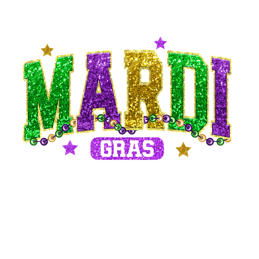 Bright and festive Mardi Gras text adorned with glitter, beads, and stars, celebrating the vibrant spirit of this lively festival.DTF Transfers