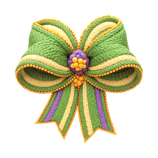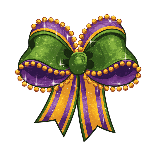 A vibrant green, purple, and gold decorative bow featuring sparkling embellishments, perfect for festive occasions like Mardi Gras.DTF Transfers