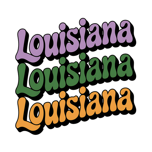 Vibrant and playful design featuring the word "Louisiana" in three different colors and bold, retro-style typography.DTF Transfers