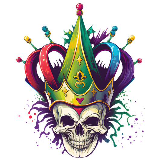 This vibrant design features a skull adorned with a colorful jester crown, radiating an eye-catching, playful energy.DTF Transfers
