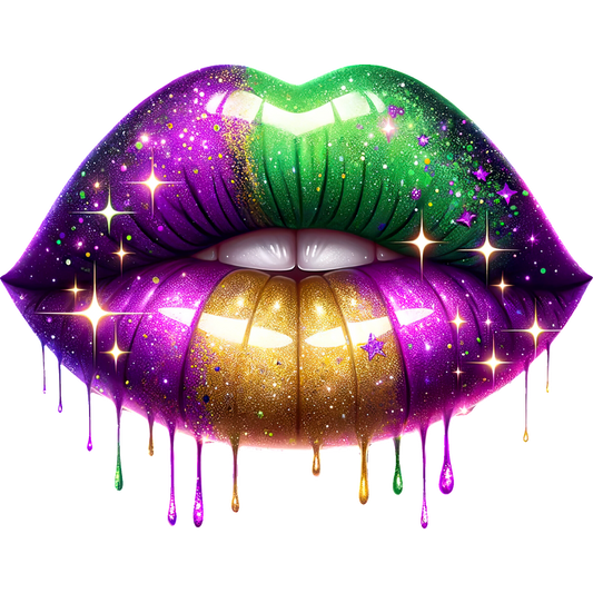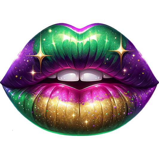This vibrant graphic features a pair of glamorously decorated lips in green, purple, and gold with sparkling accents.DTF Transfers