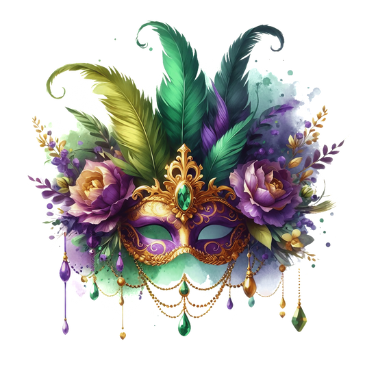 Celebrate Mardi Gras with this vibrant design featuring a colorful mask, festive leaves, and playful lettering!DTF Transfers
