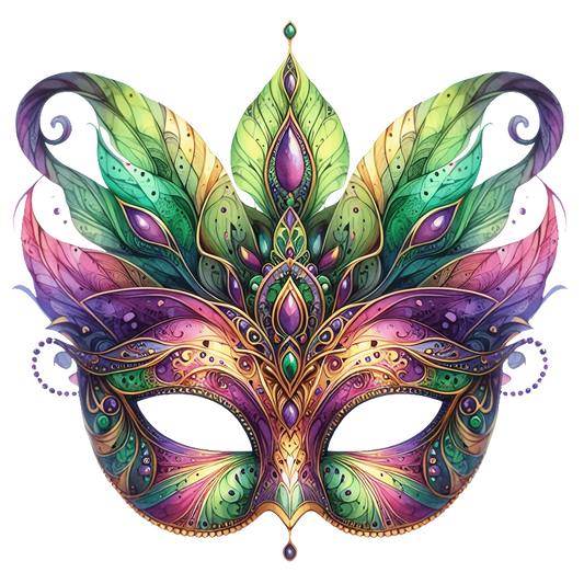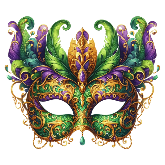 This vibrant, intricately designed masquerade mask features rich green, purple, and gold hues, adorned with elegant feather details.DTF Transfers