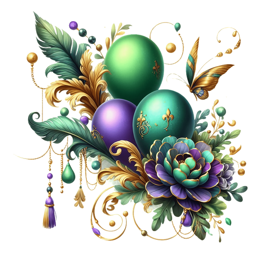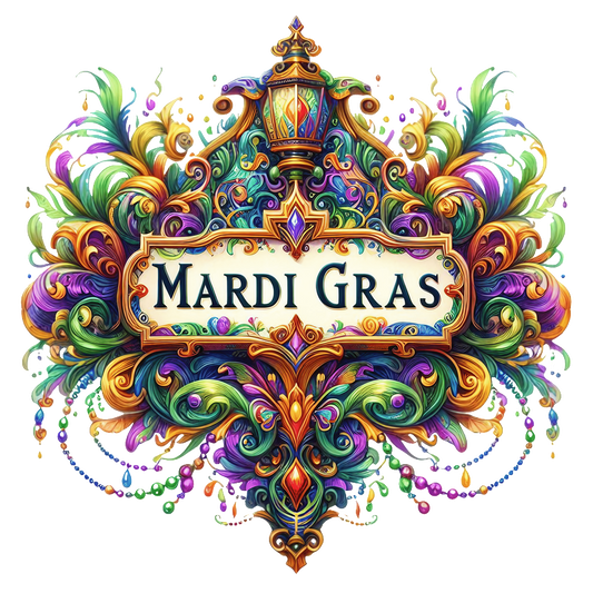 A vibrant, ornate Mardi Gras sign adorned with colorful swirls, beads, and a lantern, radiating festive energy and cheer.DTF Transfers