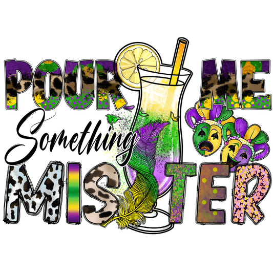 Bright and festive design featuring a cocktail glass, vibrant colors, and fun Mardi Gras elements with the phrase "Pour Me Something Mister."DTF Transfers