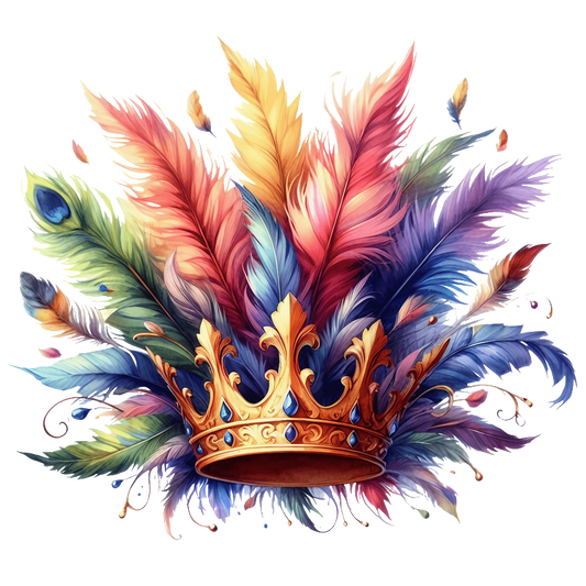 A vibrant crown surrounded by colorful, artistic feathers, featuring shades of blue, pink, and gold for a regal touch.DTF Transfers