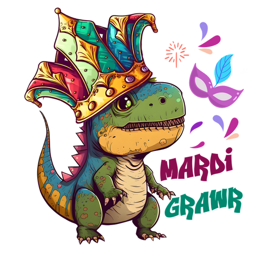 A festive cartoon dinosaur wearing a colorful Mardi Gras crown, surrounded by playful decorations and vibrant text.DTF Transfers