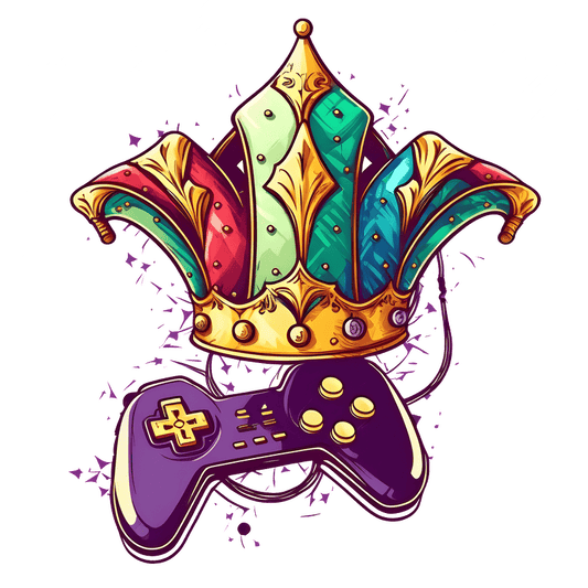 A vibrant illustration featuring a colorful crown with intricate designs resting atop a purple game controller.DTF Transfers