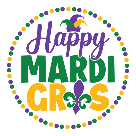Celebrate Mardi Gras with this vibrant design featuring playful text, colorful beads, and a festive jester hat!DTF Transfers