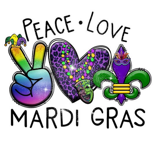 Celebrate Mardi Gras with vibrant artwork featuring a peace sign, a leopard-print heart, beads, and festive symbols!DTF Transfers