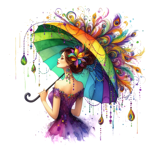 A vibrant, artistic illustration featuring a colorful umbrella adorned with peacock feathers, complementing the elegant figure in a purple dress.DTF Transfers