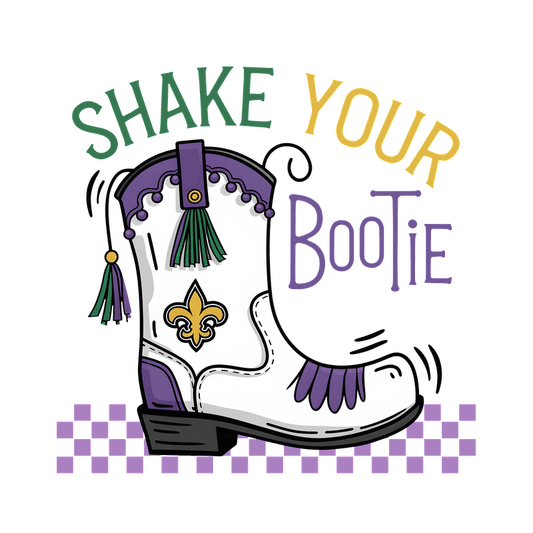 Lively illustration of a decorated white boot with purple and green accents, featuring the playful phrase "Shake Your Bootie."DTF Transfers