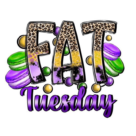 Celebrate Fat Tuesday with vibrant, leopard-patterned lettering and colorful macaroons, capturing the festive spirit of this joyful occasion!DTF Transfers