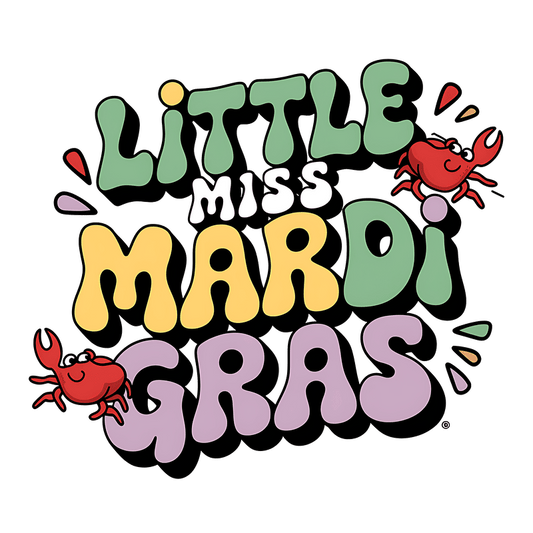 Celebrate Mardi Gras with this fun "Little Miss Mardi Gras" design featuring cheerful lettering and playful crab illustrations!DTF Transfers