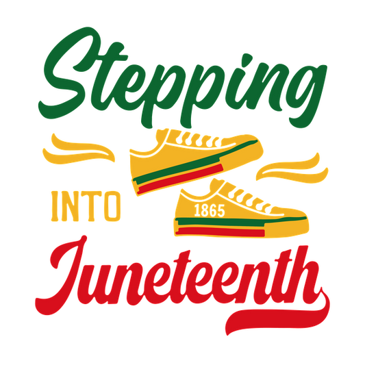 Celebre el Juneteenth con zapatillas deportivas vibrantes y un texto colorido que proclama "Entrando en Juneteenth", enfatizando la unidad y la herencia.