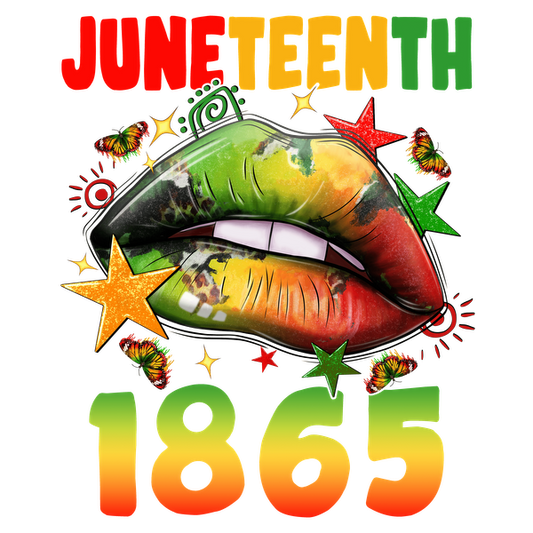 Un gráfico vibrante que celebra el Juneteenth con labios coloridos y texto en negrita "Juneteenth 1865", que muestra el orgullo y la herencia cultural.