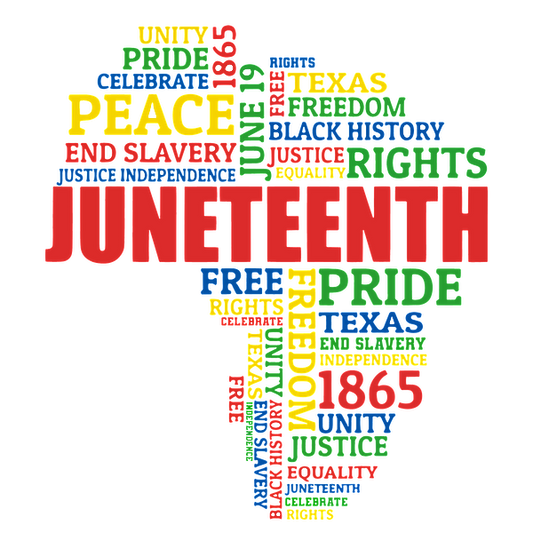 Una nube de palabras colorida que resalta los temas del Juneteenth, incluidas palabras como "libertad", "unidad", "justicia" y "Texas 1865".