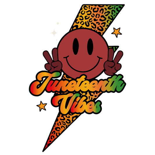 Gráfico vibrante que presenta una carita sonriente alegre y el texto "Juneteenth Vibes", acentuado con un rayo colorido con estampado de leopardo.