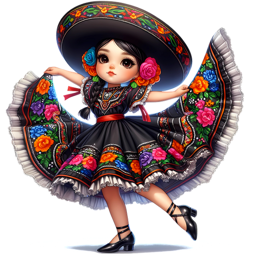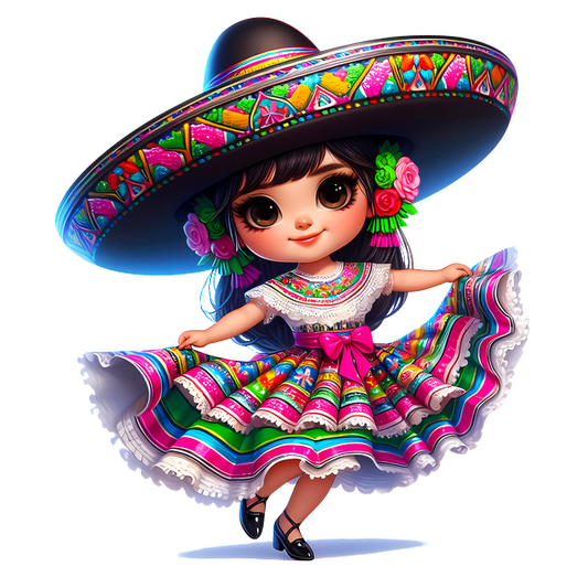 Precio habitual A partir de £0.75 GBPPrecio habitualPrecio unitario / por£2.39 GBPPrecio de oferta A partir de £0.75 GBPUna encantadora joven con un colorido vestido tradicional mexicano, completo con un sombrero de ala ancha y detalles florales.