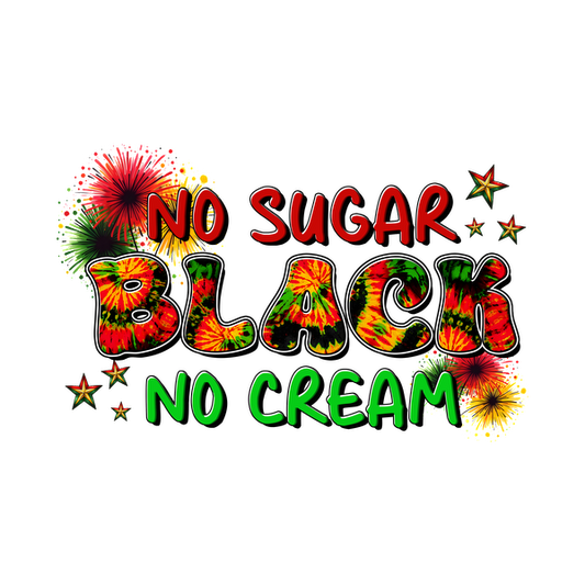 Diseño gráfico vibrante que presenta la frase "Sin azúcar, negro, sin crema" en letras coloridas con acentos festivos.