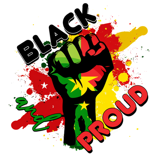 Un gráfico vibrante que presenta un puño levantado en negro, rojo, amarillo y verde, que proclama "NEGRO y ORGULLOSO" y celebra el empoderamiento.