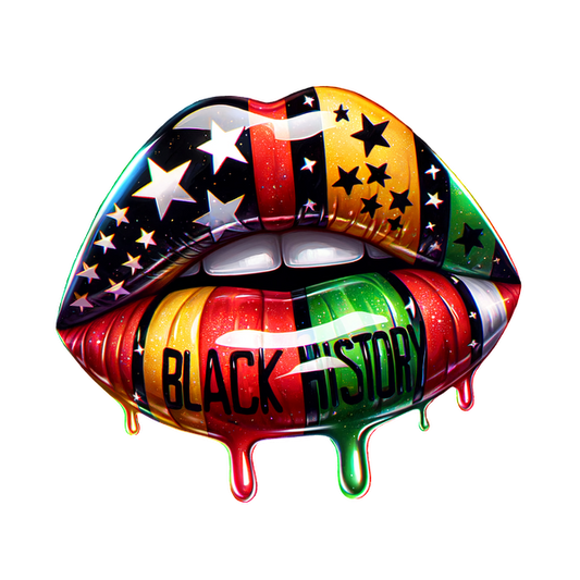 Labios vibrantes adornados con banderas y estrellas coloridas celebran la "Historia Negra", rebosando estilo artístico y orgullo cultural.