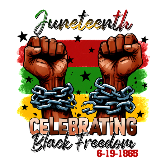 Obra de arte audaz que celebra el Juneteenth, con puños en alto con cadenas sobre un fondo colorido que simboliza la libertad y la herencia de los negros.