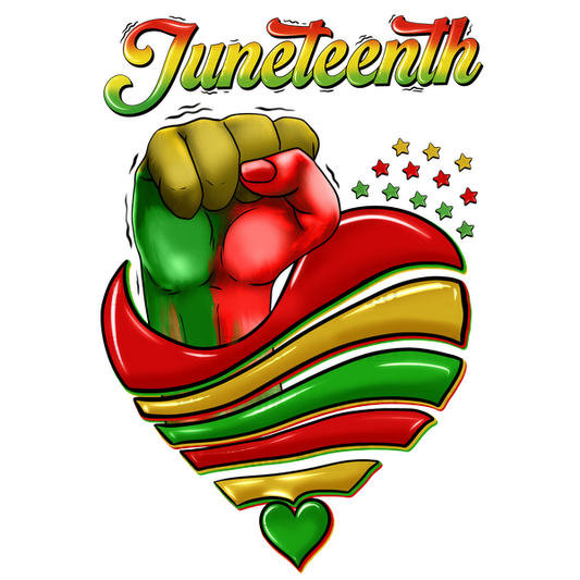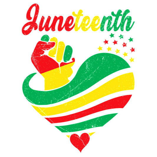 Celebre el 19 de junio con este diseño vibrante que presenta un puño levantado, un corazón colorido y colores patrióticos que simbolizan la libertad y la unidad.