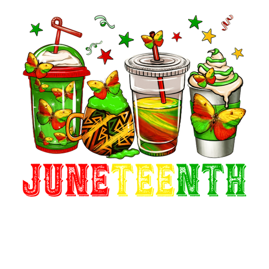 Celebre el Juneteenth con diseños de bebidas vibrantes que incluyen bebidas coloridas y mariposas, mostrando colores alegres de rojo, verde y amarillo.