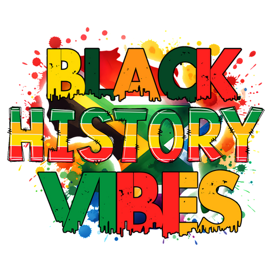 Un gráfico vibrante que celebra las "vibraciones de la historia negra" con letras llamativas en rojo, verde y amarillo sobre un fondo colorido.