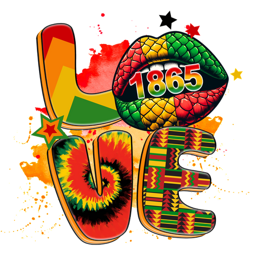 Un diseño vibrante que celebra el Juneteenth, presentando el año "1865" con colores llamativos, estampados animales y estrellas festivas.