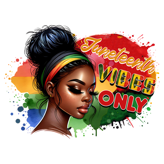 Una ilustración vibrante que celebra el Juneteenth, con una mujer joven con accesorios para el cabello coloridos y las palabras "Juneteenth Vibes Only".