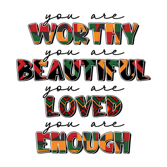 Obra de arte tipográfica inspiradora que te recuerda que eres digno, hermoso, amado y suficiente, con colores y patrones vibrantes.