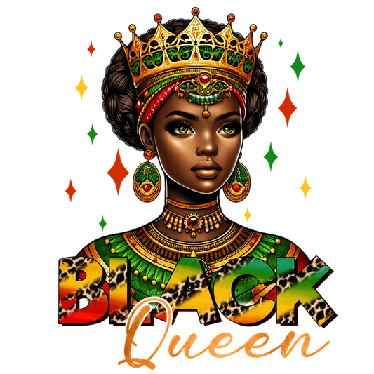 Una impresionante ilustración de una reina negra majestuosa adornada con colores vibrantes, joyas intrincadas y una corona dorada, que celebra su herencia.