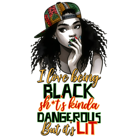 Una ilustración divertida de una niña con cabello rizado, que celebra su identidad con el texto: "Me encanta ser negra, es un poco peligroso, pero es genial".