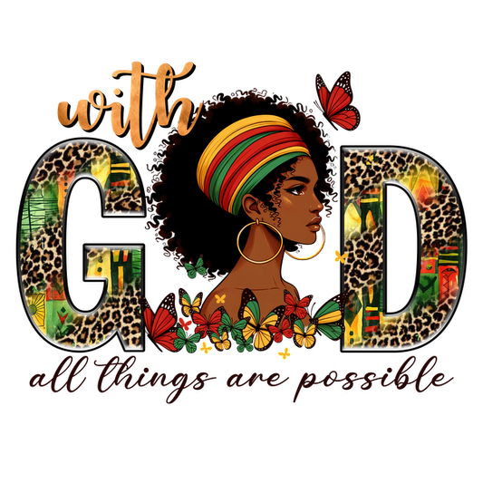 Precio habitual A partir de £0.75 GBPPrecio habitualPrecio unitario / por£2.39 GBPPrecio de oferta A partir de £0.75 GBPUn gráfico vibrante que presenta a una mujer con un colorido pañuelo en la cabeza, rodeada de naturaleza, enfatizando que "con Dios todas las cosas son posibles".