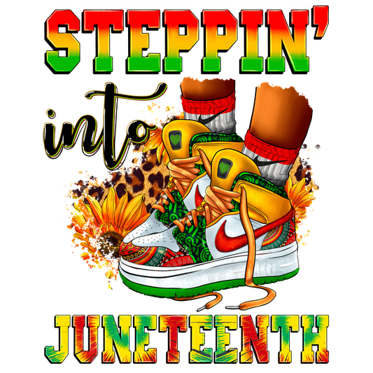 Gráfico de zapatillas vibrante que celebra Juneteenth, con diseños coloridos y letras llamativas que dicen "Steppin' into Juneteenth".