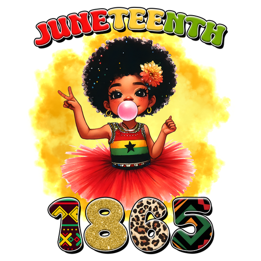 Celebre el Juneteenth con esta vibrante ilustración de una niña con un traje colorido, que simboliza la libertad y la alegría, conmemorada el año 1865.