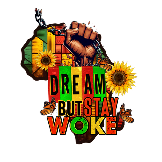 Un diseño gráfico vibrante que presenta un puño levantado, girasoles y el texto "SUEÑA PERO MANTENTE DESPIERTO" sobre un fondo de mapa africano colorido.