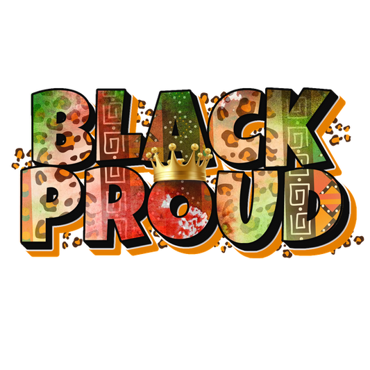 Un diseño vibrante y empoderador que presenta las palabras "BLACK PROUD" adornadas con una corona y patrones coloridos.