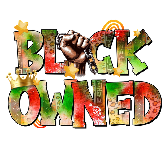 Diseño atrevido y vibrante "BLOCK OWNED" que presenta un puño levantado y acentos coloridos, que simbolizan el empoderamiento y la propiedad de la comunidad.