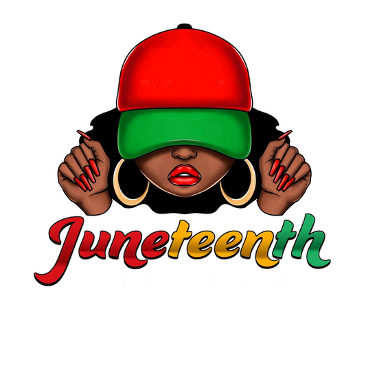 Un gráfico vibrante que enfatiza el Juneteenth, con una mujer con una gorra roja y verde y un texto en negrita: "Juneteenth Free-ish Since 1865".