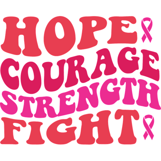 Precio habitual A partir de £0.75 GBPPrecio habitualPrecio unitario / por£2.39 GBPPrecio de oferta A partir de £0.75 GBPUn gráfico motivacional vibrante que presenta las palabras "Esperanza, coraje, fuerza, lucha" en colores llamativos junto a cintas rosas simbólicas.