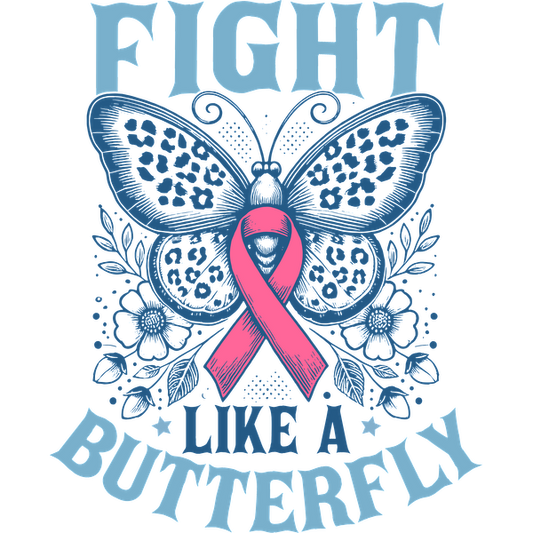 Un diseño de mariposa vibrante con un lazo rosa y la frase empoderadora "Lucha como una mariposa", que simboliza fuerza y resiliencia.
