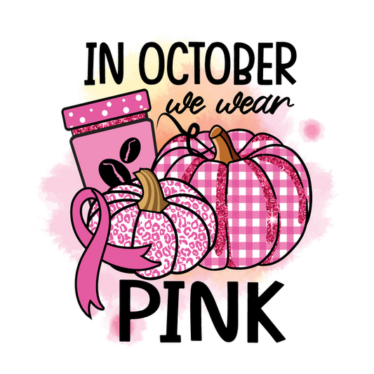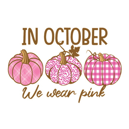 Un diseño caprichoso que presenta calabazas rosas en varios patrones, con la divertida frase "Time to Wear Pink" debajo.