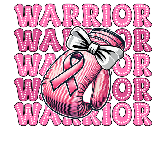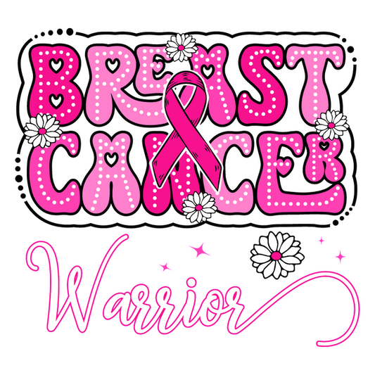 Un diseño vibrante que presenta "Guerrero contra el cáncer de mama" en rosa con una cinta y detalles florales, que simbolizan fuerza y apoyo.